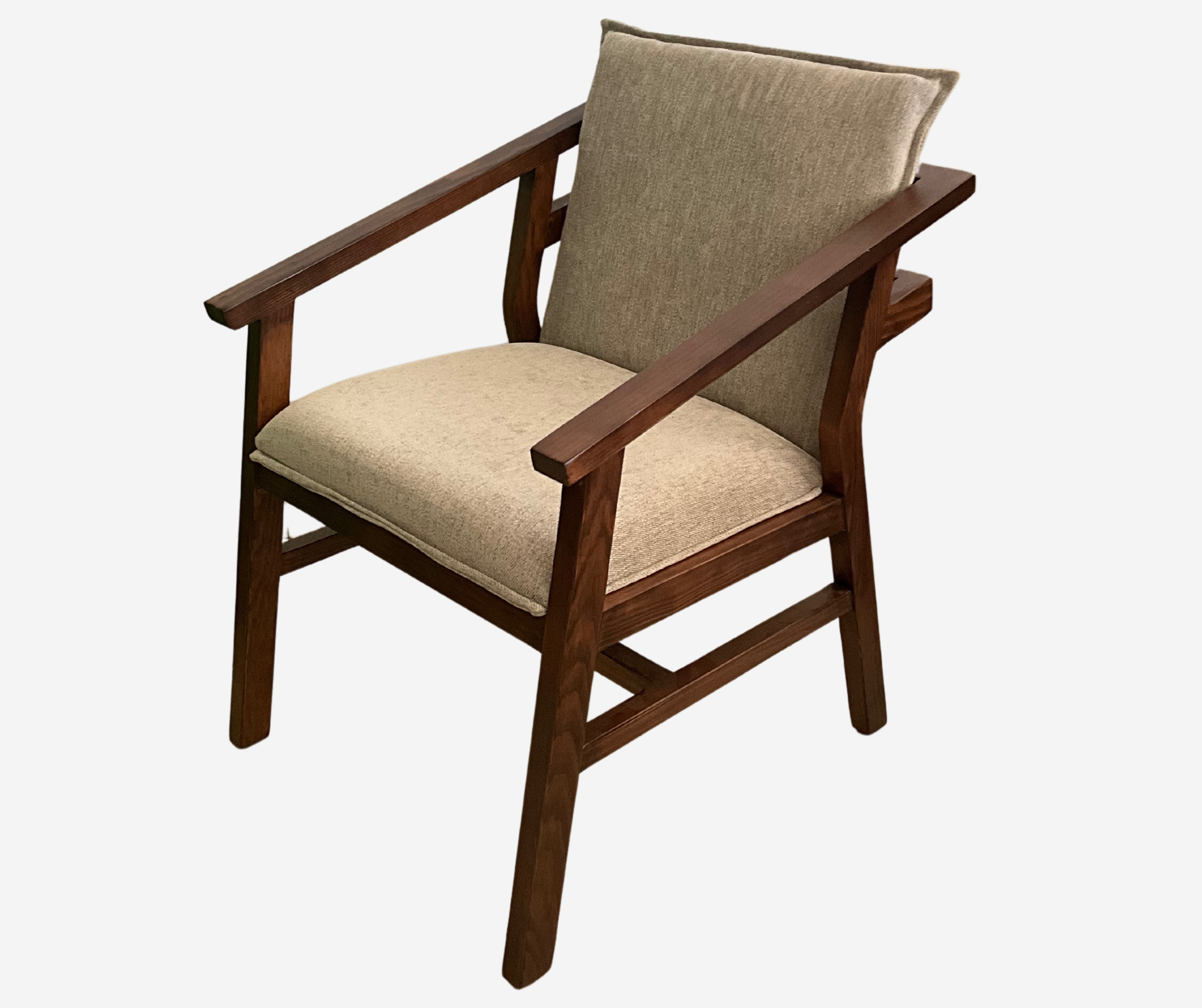 La estructura de sus patas y descansa brazos de madera le confiere una particular firmeza, mientras su tapizado griS crea un diseño elegante Y moderno.